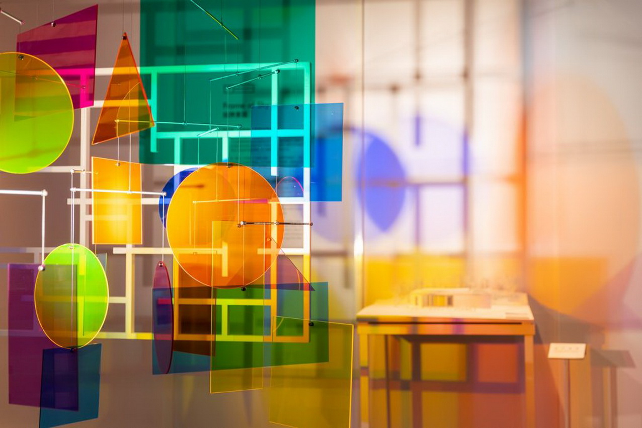 展覽劃分為4個區域,S型觀展動線搭配深入淺出的理論,結合當代案例的古今對話,呈現多種面向,讓民眾循序漸進地了解百年包浩斯;設計團隊更將台灣隨處可見的藍白條紋帆布、塑料板,經過包浩斯語言轉化為貫串展場的視覺元素,不但貼近你我的生活型態,也可以看出策展團隊在材質結構、裝置與空間互動上的趣味。