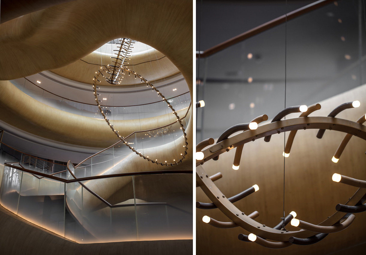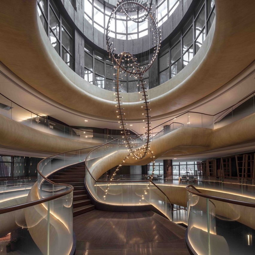 設計靈感來自於莫干山周圍的自然環境,從酒店大堂開始,戲劇性的樓梯引導著賓客如茶農般漫遊,陽光通過天窗投射至室內,搭配環型訂製燈具,和建築體相互輝映。