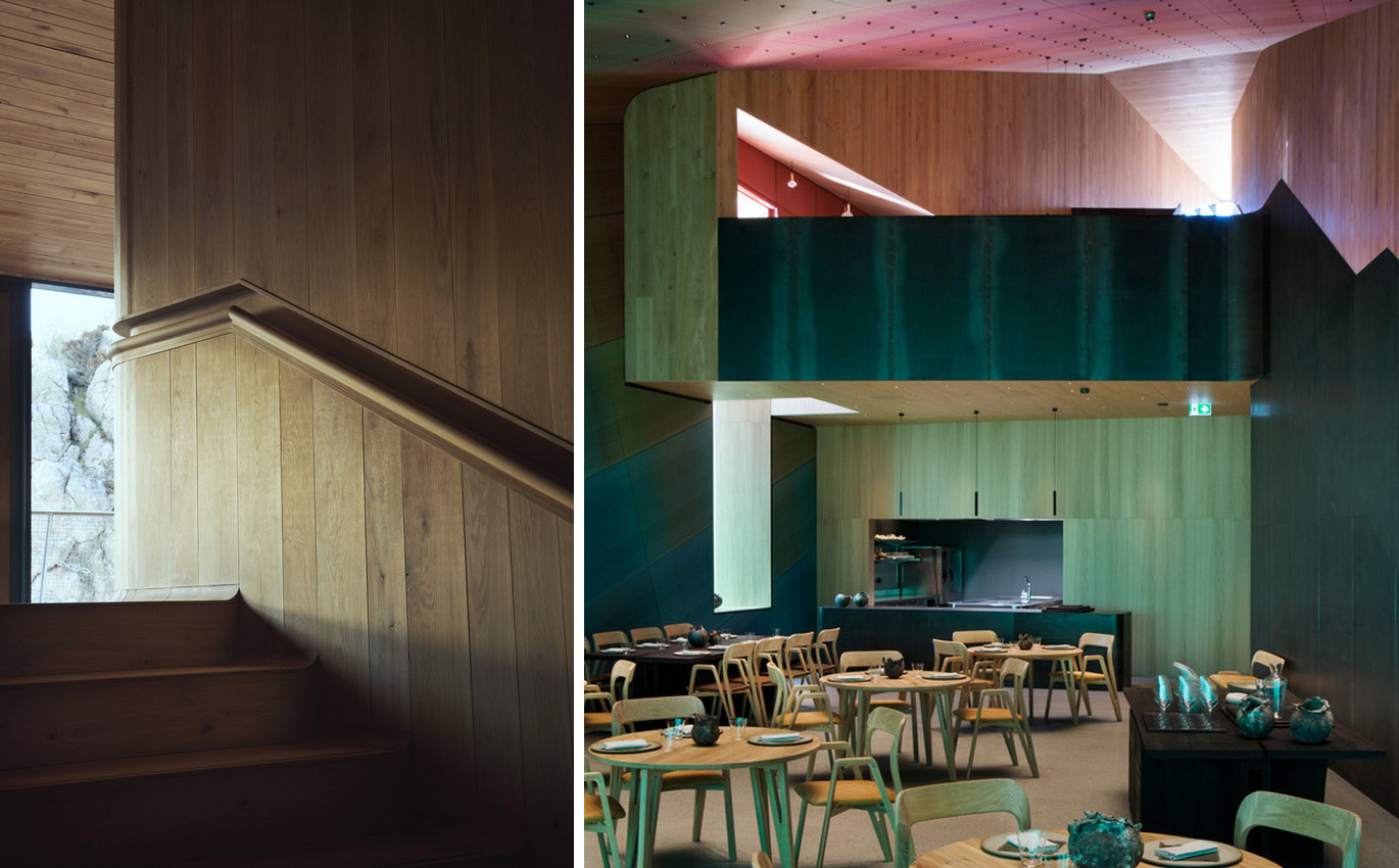 在挪威語中,under有「在下面」和「奇觀」的意思,建築半沉於海中,111英尺長的結構打破水面,錨定在海床上,厚實的混凝土牆能承受潮汐變化,並有人工礁石的作用供海洋生物棲息,展現海陸之間微妙的生態平衡。