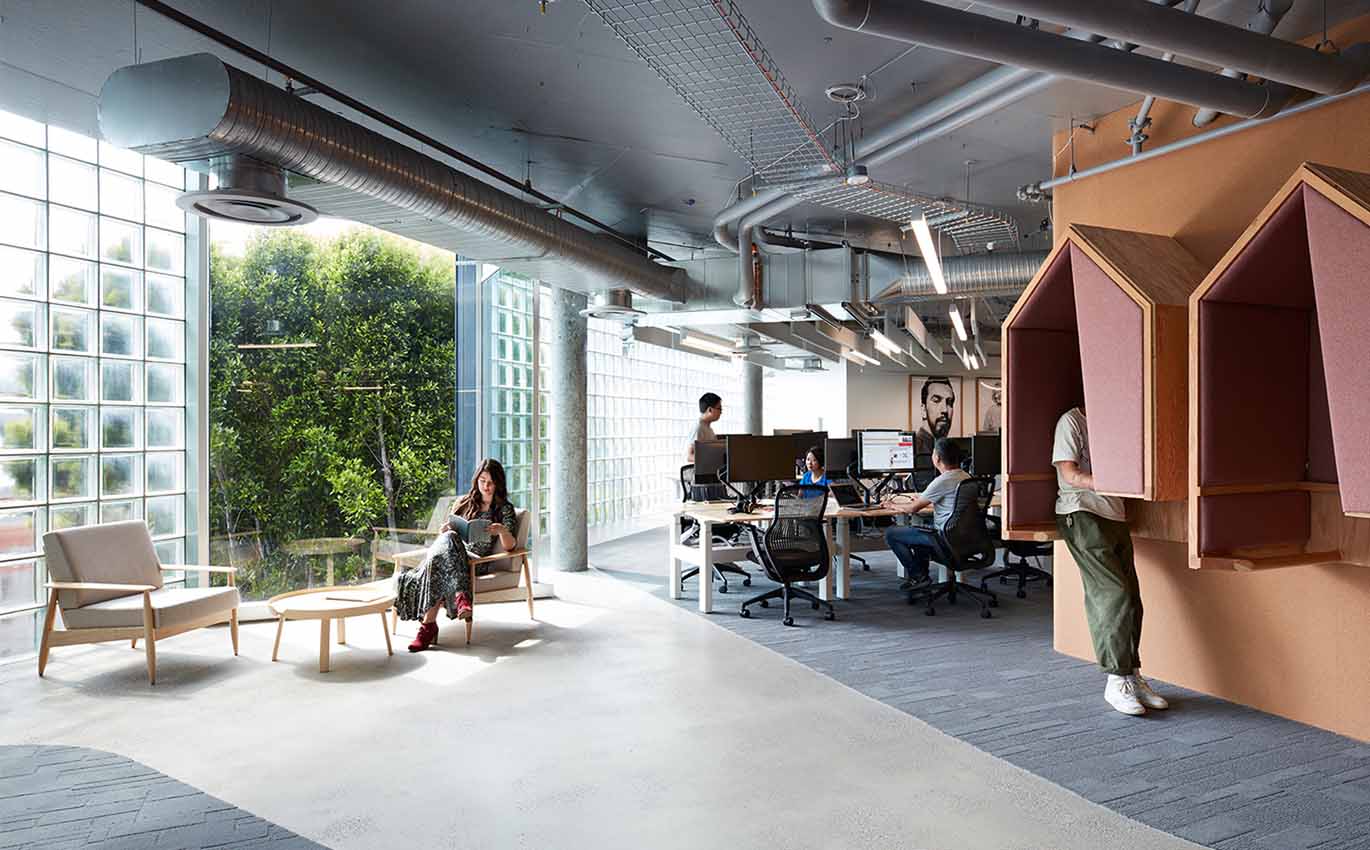 Airbnb 東京辦公室位於繁忙的新宿區,新的規劃先讓員工討論描繪理想的辦公室輪廓:擁有社區生活感的工作環境,充滿自然元素的城市隱園。再由Airbnb設計總監Rebecca Ruggle與當地事務所Suppose Design Office合作,將員工的需求轉化實踐,挑高的中庭,自然天光灑落在蓊鬱植栽和錯落不一的工作區域,彷彿露天咖啡廳一般悠閒,空間內裝飾了員工從世界各地蒐集的物件裝飾,不僅收藏了個人情感及旅遊回憶,也強化了員工間的互動及歸屬感。