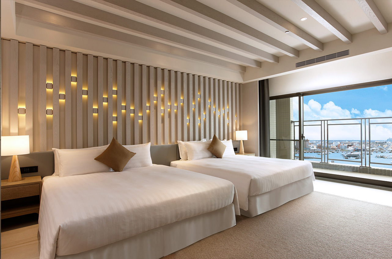 行館房型VILLA ROOM:濱海島嶼度假風情,點綴在地的人文意象;落地窗外是陽光映照海水的璀璨,令人著迷的悠閒。