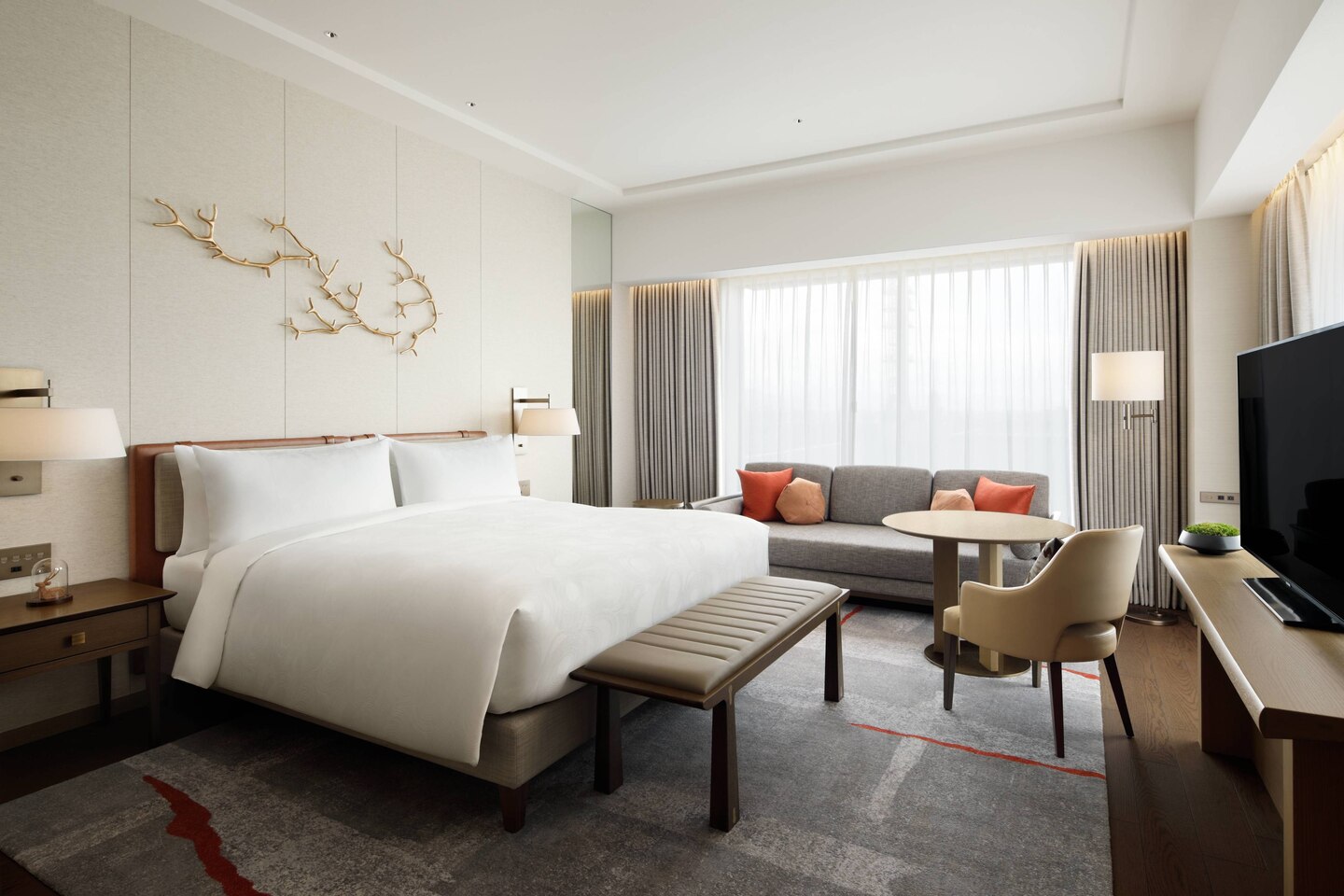 客房採用奈良傳統民居的自然底色,地毯和墊子上溫暖的橙色代表季節變化,也呼應了每年舉行的傳統火祭,床的上方則是抽象的鹿角裝置。