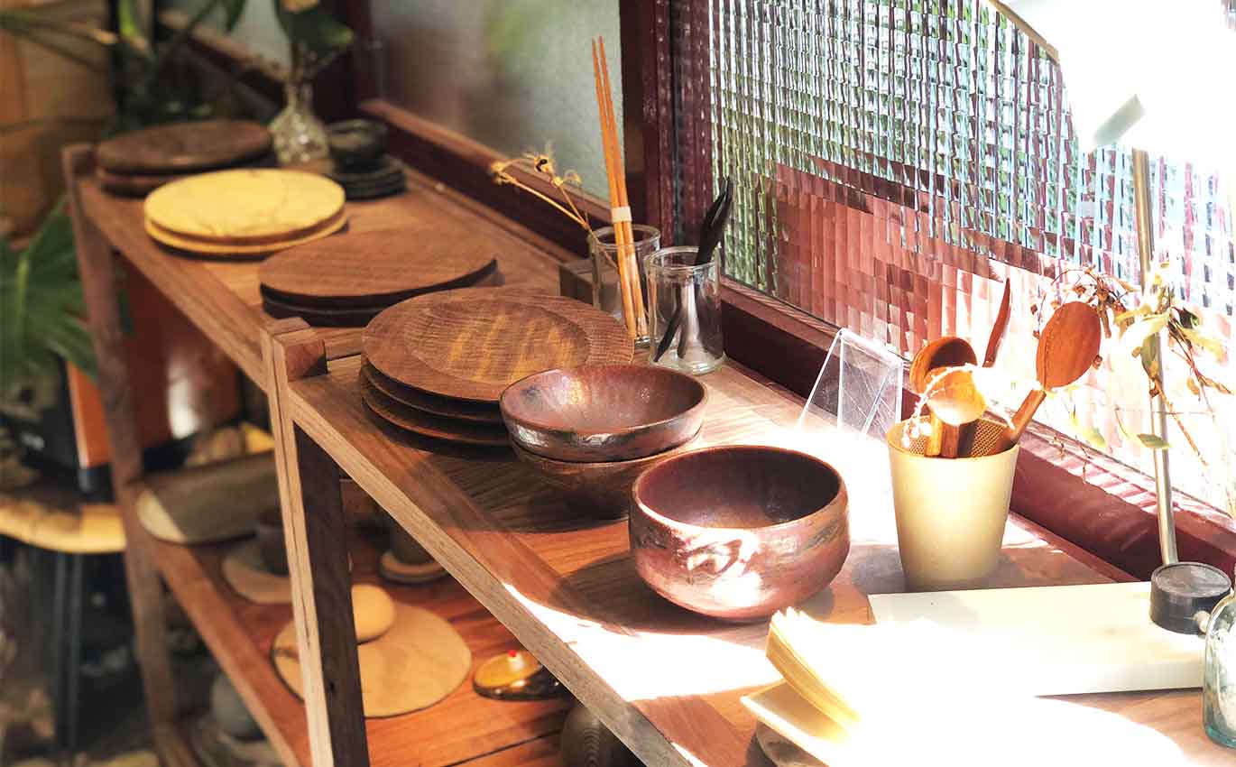 再轉進巷弄內就抵達第一間老屋改建的店面-什麼木工作室。店面外觀保留老式精美磁磚和鐵窗,各式鹿角蕨和雨林闊葉植物不矯作的恣意生長,沒有門牌和標示的大門外,只聽見木工車床刀具的聲音,讓人不禁生起好奇心探頭探腦地往窗內找答案,打開門發現是優雅擺設著生活木器及陶器的工作室。
